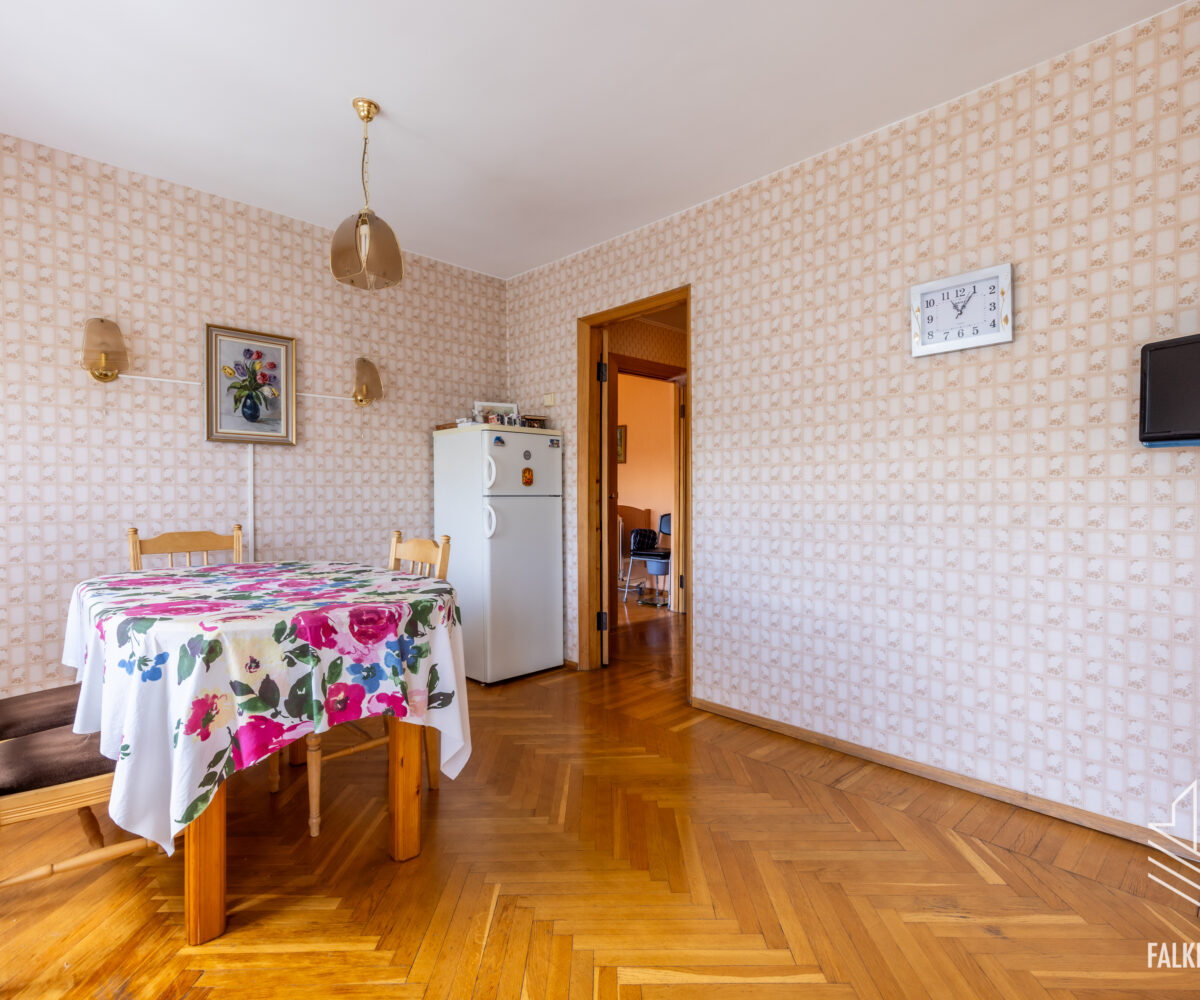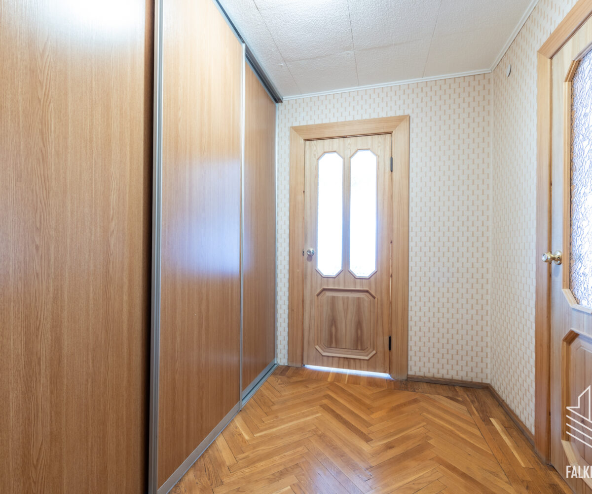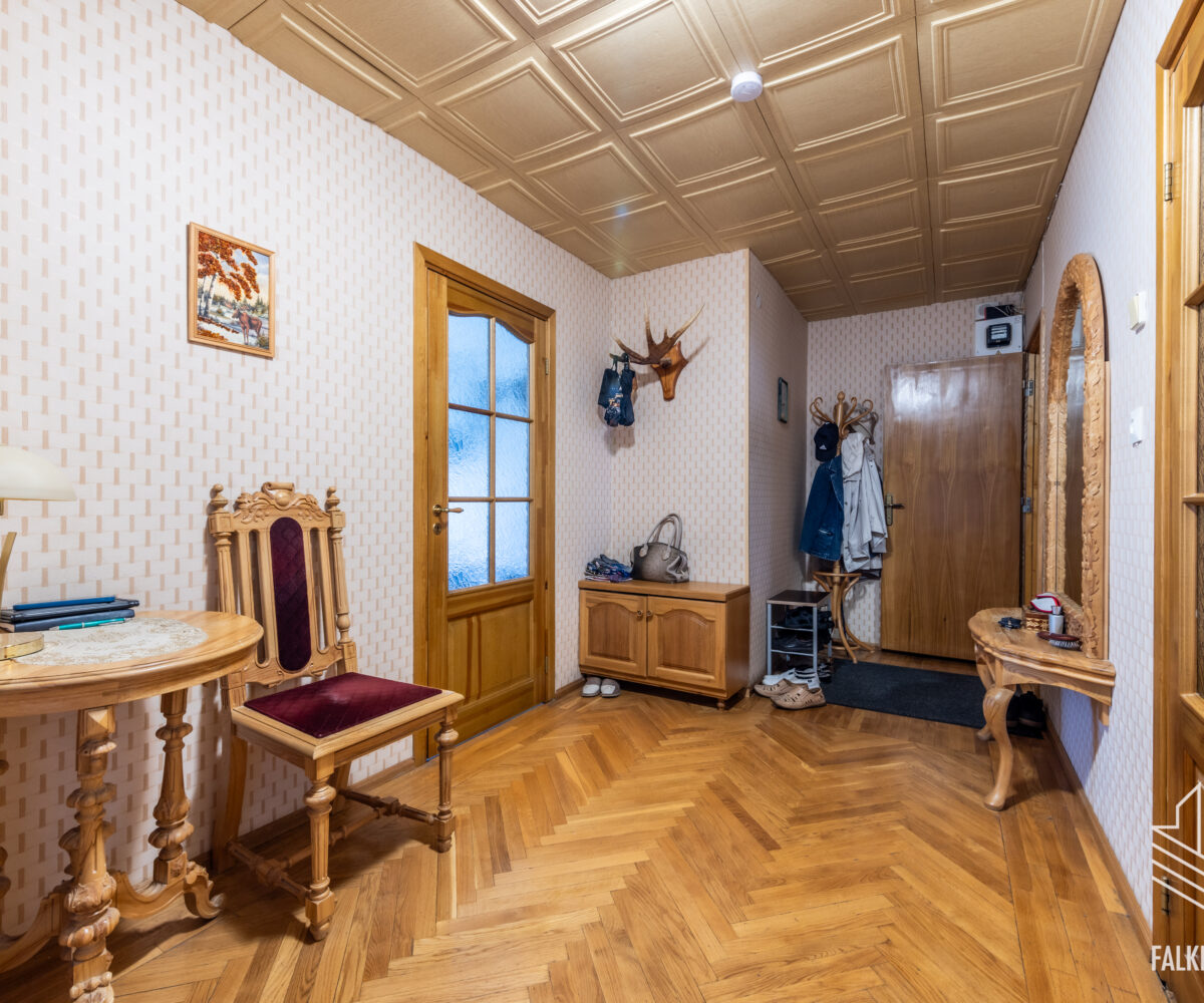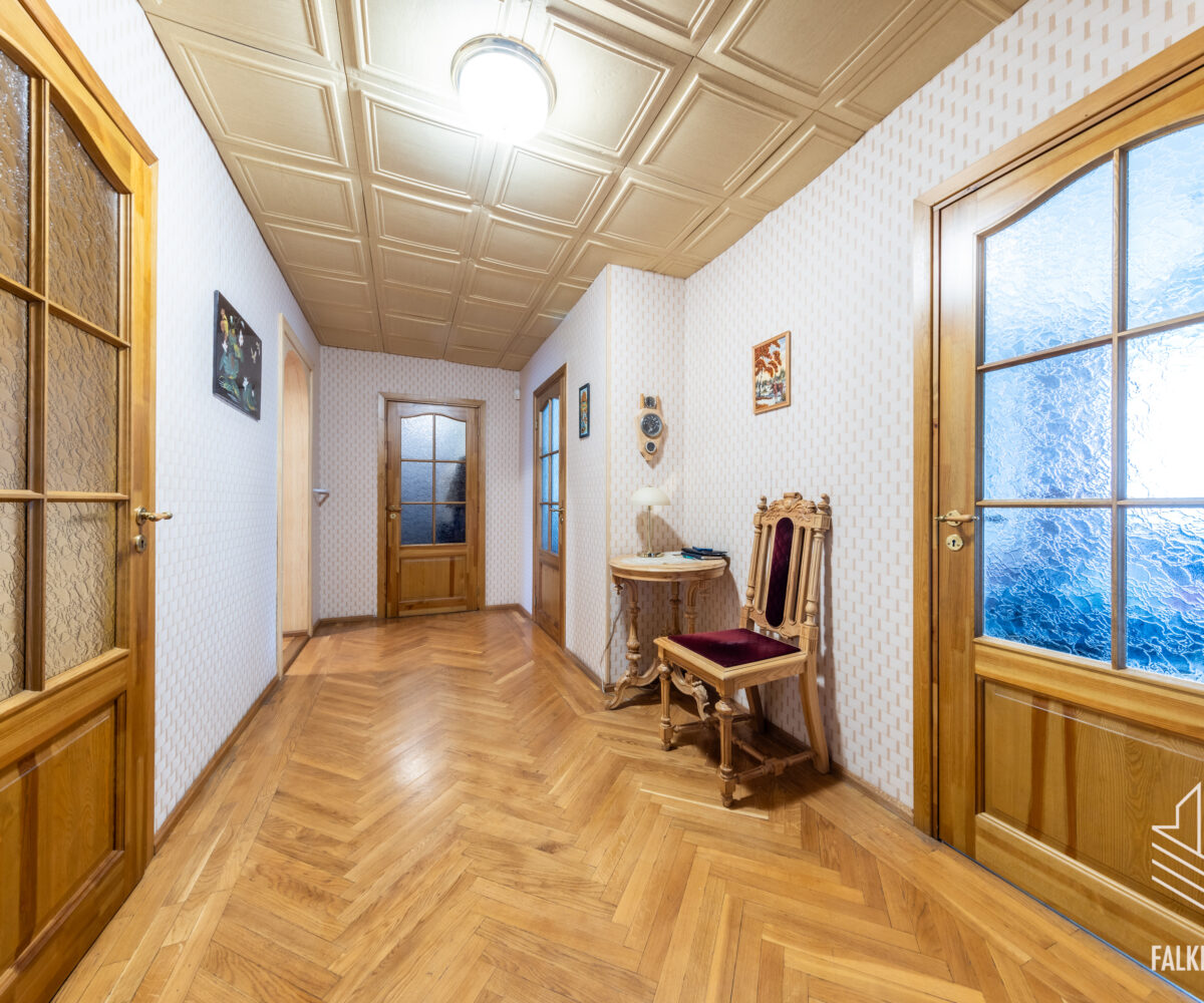 Светлая квартира находится в хорошем состоянии, полы в комнатах преимущественно паркетные, а в прихожей и на кухне – паркет из массива дуба. Стены в основном оклеены обоями светлых, игривых тонов. Межкомнатные двери из массива дерева.