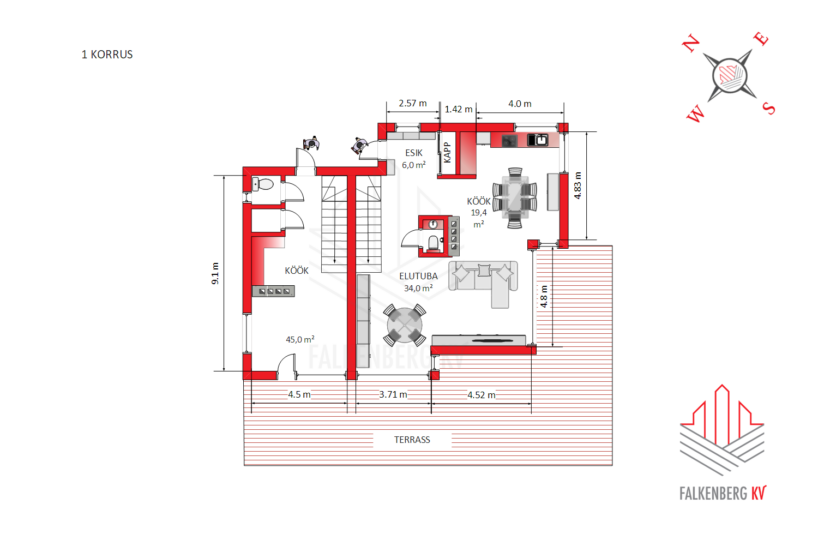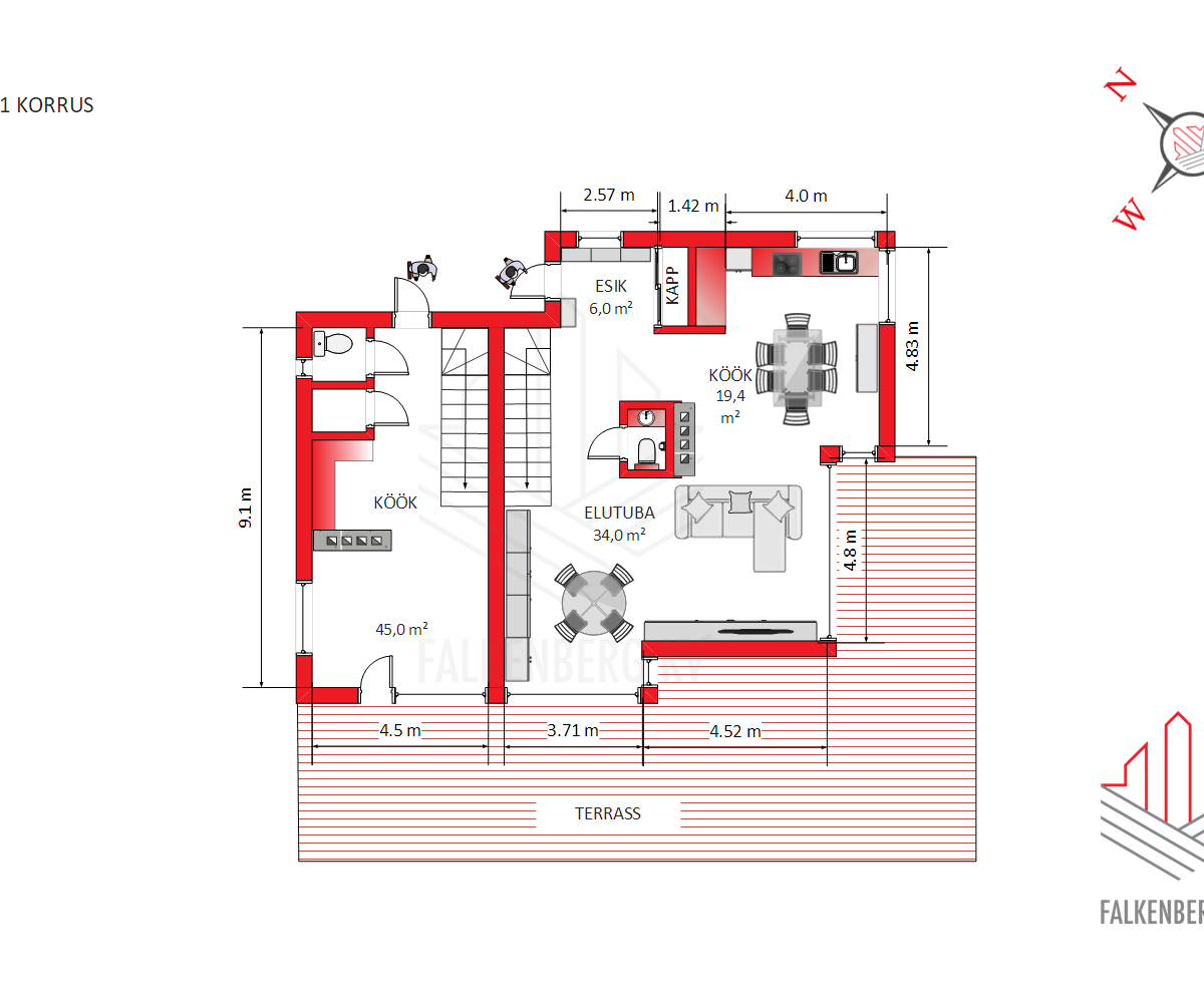 Eramu väiksemas osas on üldpinda kokku 92,6 m2 (lisaks terrass 30 m2).