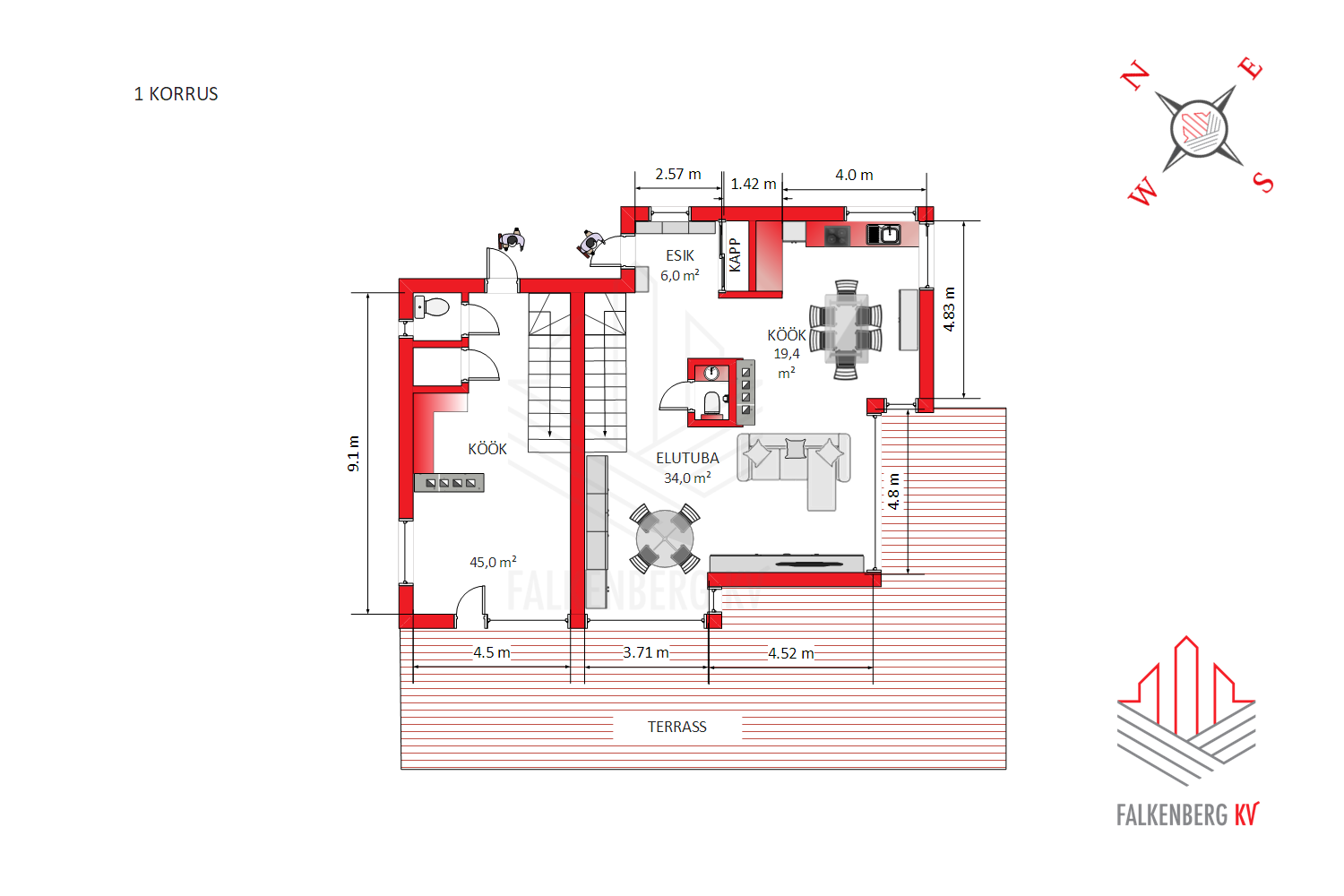 Eramu väiksemas osas on üldpinda kokku 92,6 m2 (lisaks terrass 30 m2).